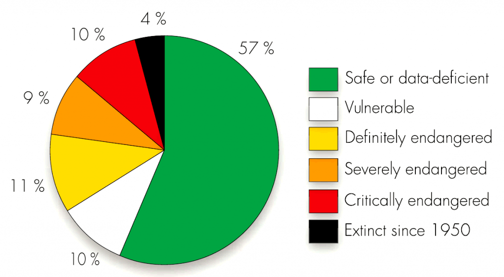 Ülkemizde çoktan aza doğru tehlike altındaki diller: Hertevin, Gagavuzca, Ladino ve Süryanice,  Abazaca, Hemşince, Lazca, Pontus Yunancası, Romani, Suret, Ermenice, Abhazca, Adige, Kabar-Çerkes dilleri ve Zazaki (Zazaca)