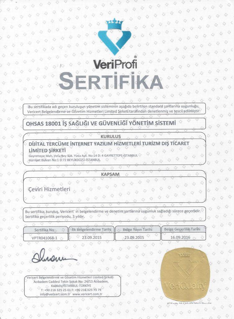 Dijital Tercüme, çalışanları korumak, üretim güvenliğini sağlamak ve işletme güvenliğini sağlamak amacına yönelik bir standart olan OHSAS […]