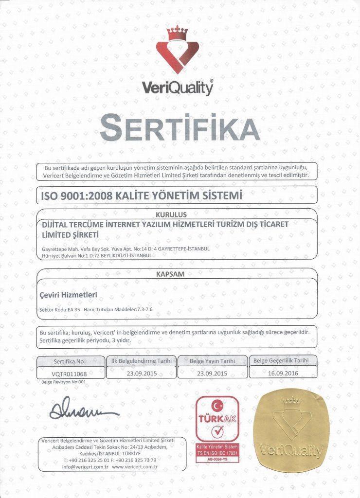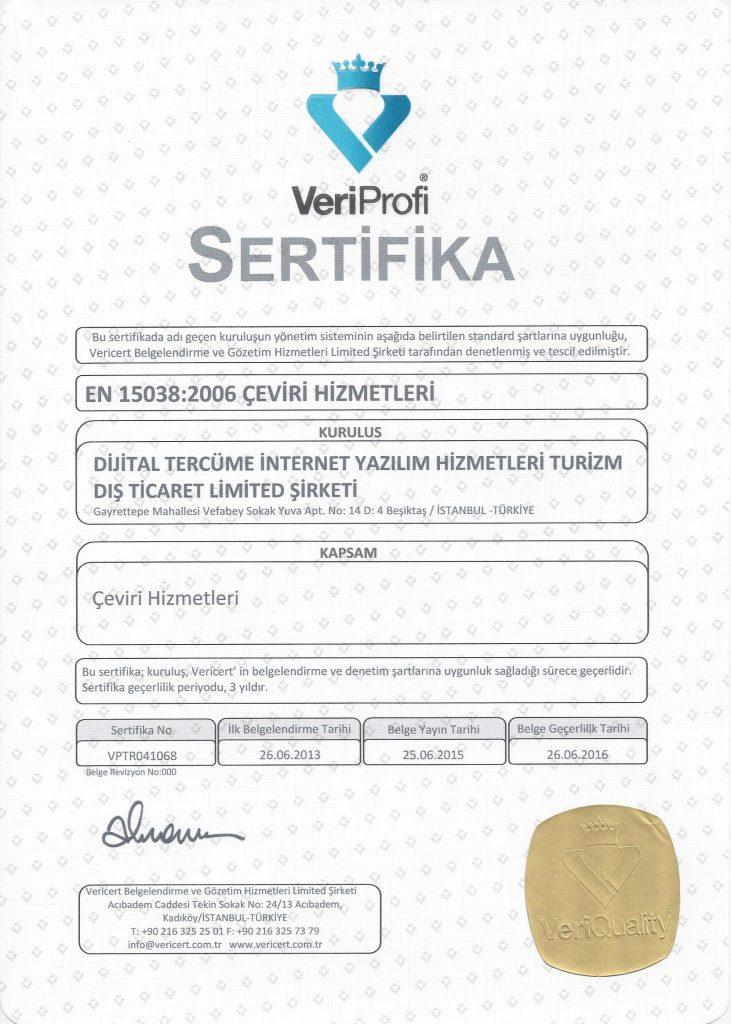 EN 15038 Çeviride Kalite Yönetimi ve Çeviri Hizmeti sertifikamızı yeniledik.