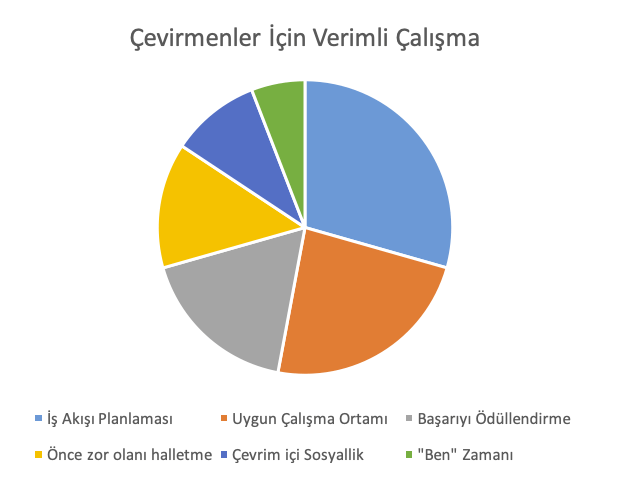 Toplam 2,5 saatten oluşan bu sürece “ pomodoro” deniyor. Günlük yoğunluğunuza bağlı olarak da dileğiniz kadar tekrarlayabiliyorsunuz. Burada önemli olan nokta 25 dakika boyunca sadece çeviriye odaklanmanız. Telefonunuza gelen mesajları yanıtlamak, sosyal medya takibi, yanınızda konuşulanlara cevap vermek gibi dikkatinizi dağıtacak her türlü etkenden uzak durmanız gerekiyor. 25 dakika için kendi hızınıza ve çevirinin ihtiyaçlarına göre ( DTP, araştırma, terminoloji vb.) bir kelime sayısı belirleyin. Örneğin 25 dakikada 250 kelime çevireceğim ve bu odaklanma sürecinde hedefinize ulaşmaya çalışın. 5 dakikalık molanızda güzel bir çay içerek kendinizi ödüllendirebilirsiniz. 2 saatin sonunda 1000 kelime hedefinize ulaştığınızda bir dostunuzla yarım saatlik bir sohbet edebilirsiniz. O gün 3000 kelimeyi tamamlamanız gerektiğinde sabah 8:30 başladığınızda saat 16:00’da tüm çeviriniz bitecek ve verimli biçimde projenizi tamamlamış olacaksınız.