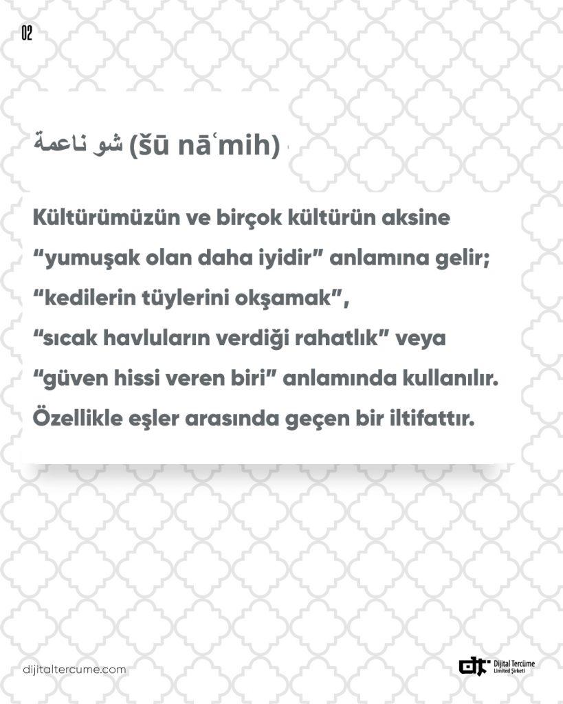 Kültürümüzün ve birçok kültürün aksine “yumuşak olan daha iyidir” anlamına gelir; “kedilerin tüylerini okşamak”, “sıcak havluların verdiği rahatlık” veya “güven hissi veren biri” anlamında kullanılır. Özellikle eşler arasında geçen bir iltifattır.