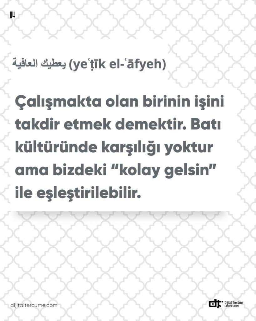 Çalışmakta olan birinin işini takdir etmek demektir. Batı kültüründe karşılığı yoktur ama bizdeki “kolay gelsin” ile eşleştirilebilir.