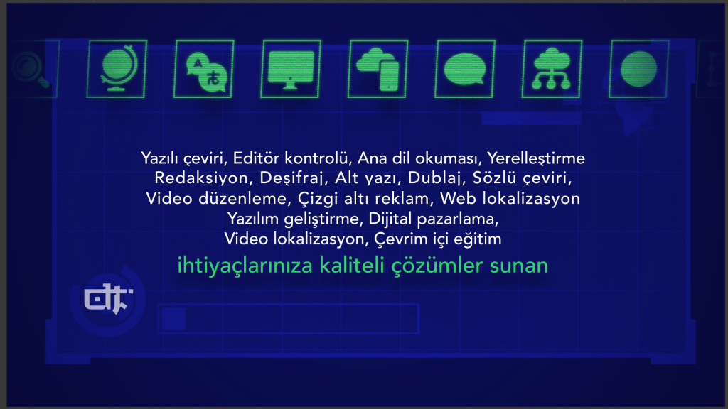 Ayrıca video düzenleme, çizgi altı reklam, web lokalizasyon, yazılım geliştirme, dijital pazarlama, video lokalizasyon, çevrim içi eğitim ihtiyaçlarınızda da yanınızdayız.