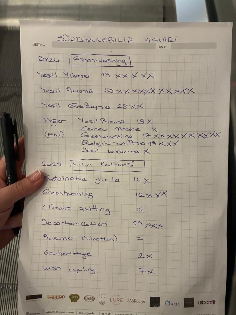 Yaptığımız oylamada: “Yeşil aklama” 69 oy alarak zirveyi kimseye kaptırmadı. Diğer öneriler: yeşil yıkama, yeşil göz boyama, çevreci maske, ekolojik yanıltma, yeşil kandırma, yeşil badana oldu. Daha da önemlisi terimi İngilizce bırakırım diyenlerin oranı %19’a indi, geçen yıl bu oran %39’du. Bu, Türkçenin sürdürülebilirlik alanında güç kazandığının net bir göstergesi.